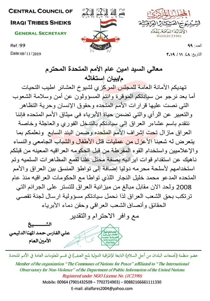 الامين العام لمجلس شيوخ العشائر العراقية يبعث برساله الى الامين العام للامم المتحدة يطالبه فيها بالتدخل لحماية الشعب العراقي والخبراء مظاهرات الشعب العراقي تستهدف النفوذ الايراني فى المقام الاول