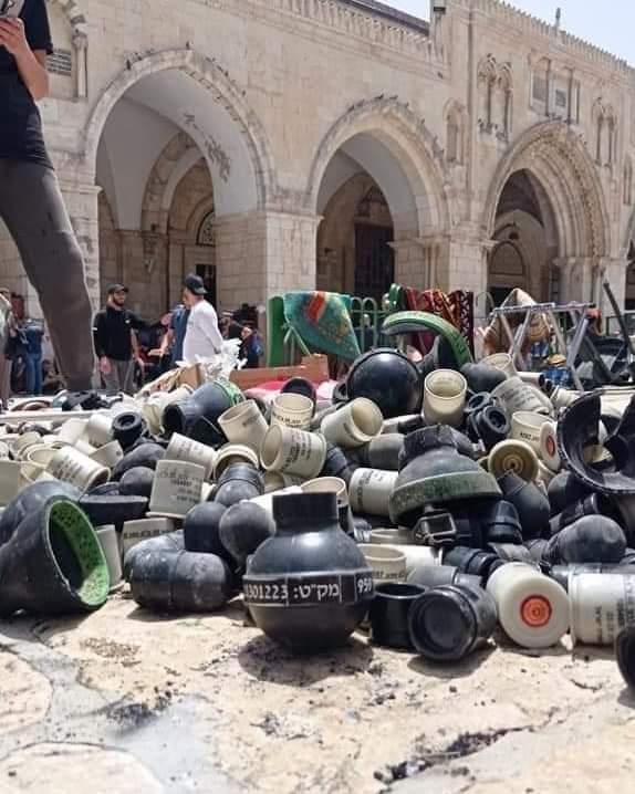 مخلفات من قنابل الصوت والغاز التي اطلقتها قوات الاحتلال صوب المصلين في المسجد الأقصى المبارك بمدينة #القدس المحتلة