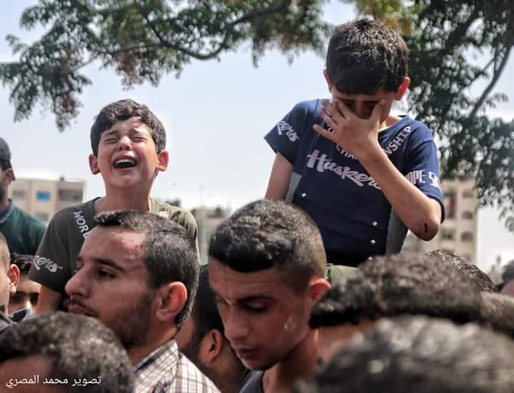 ابن شهيد يُلقي نظرة الوداع الأخيرة على والده الذي ارتقى جرّاء قصف الاحتلال الإسرائيلي امس على غزة ..المجد والخلود للشهداء