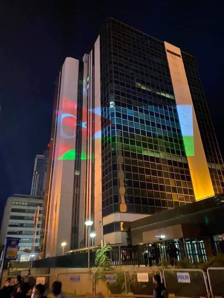 أتراك يضيؤون العلم الفلسطيني مع العلم التركي على قنصلية الإحتلال في تركيا ..