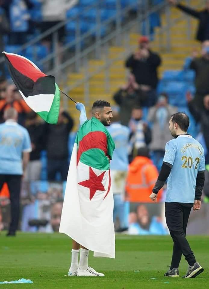 اللاعب الجزائري رياض محرز يرفع علم فلسطين أثناء احتفالات مانشستر سيتي بالدوري رياض محرز يحتفل بالرايتين الجزائرية والفلسطينية