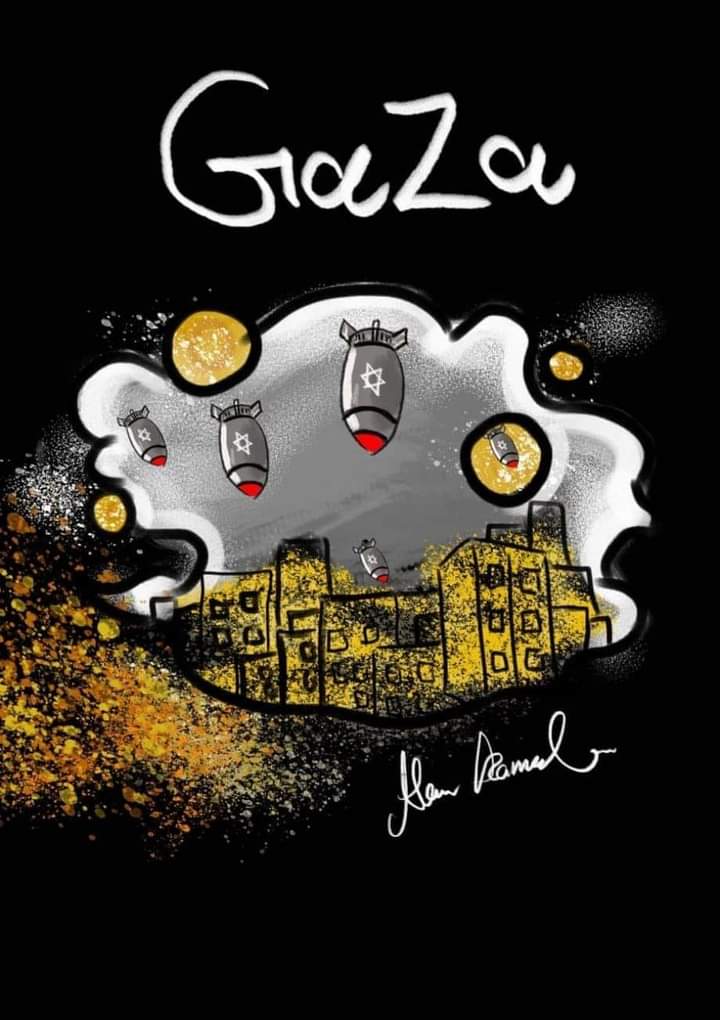 اللوحة والقلم كانا الطريقة الوحيد لتعبر الشابة آلاء الجعبري (25 عامًا) عما يجول داخل قلبها، وما كان يدور حولها من أحداث وتصعيد وحرب ودمار وعدوان وخوف خلال أكثر من عشر أيام على قطاع غزة، إلى جانب ما الذي يمكن أن يتخيله العالم الخارجي في اذهانهم تجاه القطاع، حيث قامت الجعبري للتعبير عن ذلك بطريقتها الخاصة، وهي الرسم، فاستثمرت الصور التي التقطها مصورون صحفيون للدمار والركام، وأضافت عليها بعض اللمسات لتظهر الغزي المحب للحياة، حيث رأت أن القلم واللوحة طريقتها في الدفاع عن القضية الفلسطينية وعما يدور في غزة.