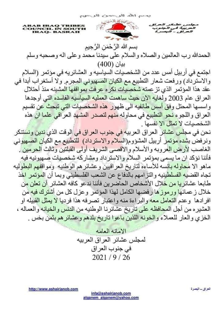 نحن في مجلس عشائر العراق العربيه في جنوب العراق في الوقت الذي ندين ونستنكر ونرفض بشده مؤتمر أربيل المشؤوم ( السلام والاسترداد ) للتطبيع مع الكيان الصهيوني الغاصب لأرض العروبه والأسلام والاقصى الشريف أولى القبلتين وثالث الحرمين .
