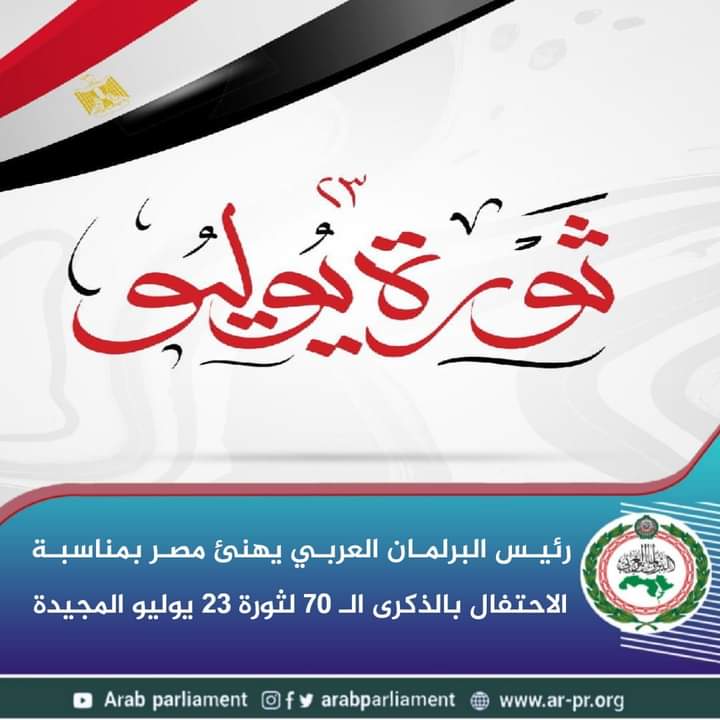 هنأ صاحب المعالي السيد عادل بن عبدالرحمن العسومي رئيس البرلمان العربي، فخامة الرئيس عبدالفتاح السيسي رئيس جمهورية مصر العربية وحكومة وبرلمان وشعب مصر، بمناسبة الذكرى الـ 70 لثورة 23 يوليو المجيدة، مؤكدا أنها تمثل ملحمة وطنية ونقطة تحول في تاريخ مصر الحديث، حيث وضعت الأسس الحقيقية لبداية حقبة جديدة قائمة على تحقيق العدالة الاجتماعية واسترداد الكرامة والقضاء على الإستعمار.