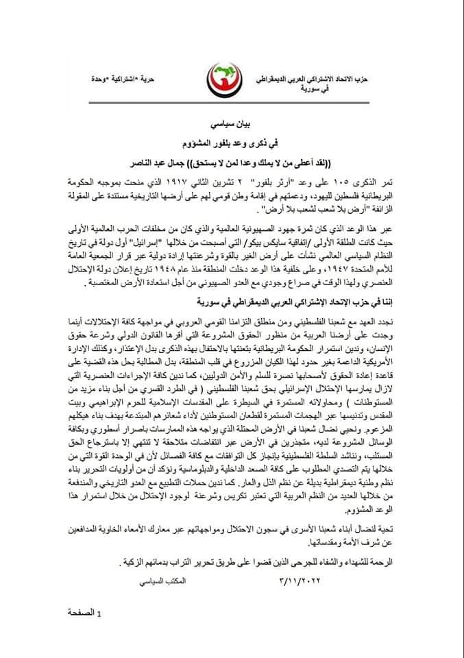 نجدد العهد مع شعبنا الفلسطيني ومن منطلق التزامنا القومي العروبي في مواجهة كافة الإحتلالات أينما وجدت على أرضنا العربية من منظور الحقوق المشروعة التي أقرها القانون الدولي وشرعة حقوق الإنسان، وندين استمرار الحكومة البريطانية بتعنتها بالاحتفال بهذه الذكرى بدل الإعتذار، وكذلك الإدارة الأمريكية الداعمة بغير حدود لهذا الكيان المزروع في قلب المنطقة، بدل المطالبة بحل هذه القضية على قاعدة إعادة الحقوق لأصحابها نصرة للسلم والأمن الدوليين، كما ندين كافة الإجراءات العنصرية التي لازال يمارسها الإحتلال الإسرائيلي بحق شعبنا الفلسطيني ( في الطرد القسري من أجل بناء مزيد من المستوطنات ) ومحاولاته المستمرة في السيطرة على المقدسات الإسلامية للحرم الإبراهيمي وبيت المقدس وتدنيسها عبر الهجمات المستمرة لقطعان المستوطنين لأداء شعائرهم المبتدعة بهدف بناء هيكلهم المزعوم. ونحيي نضال شعبنا في الأرض المحتلة الذي يواجه هذه الممارسات باصرار أسطوري وبكافة الوسائل المشروعة لديه، متجذرين في الأرض عبر انتفاضات متلاحقة لا تنتهي إلا باسترجاع الحق المستلب، ونناشد السلطة الفلسطينية بإنجاز كل التوافقات مع كافة الفصائل لأن في الوحدة القوة التي من خلالها يتم التصدي المطلوب على كافة الصعد الداخلية والدبلوماسية ونؤكد أن من أولويات التحرير بناء نظم وطنية ديمقراطية بديلة عن نظم الذل والعار. كما ندين حملات التطبيع مع العدو التاريخي والمندفعة من خلالها العديد من النظم العربية التي تعتبر تكريس وشرعنة لوجود الإحتلال من خلال استمرار هذا الوعد المشؤوم.