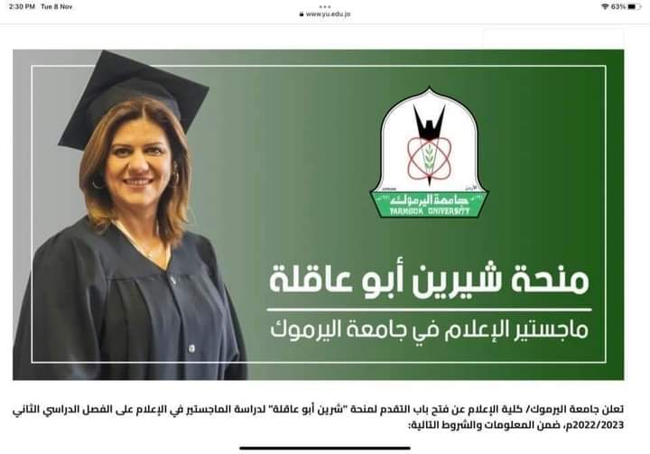 تعلن جامعة اليرموك /كلية الإعلام عن فتح باب التقدم لمنحة “شيرين أبو عاقلة” لدراسة الماجستير في الإعلام على الفصل الدراسي الثاني ٢٠٢٢ /٢٠٢٣