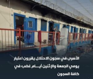 ahmed 0 تعليقات هيئة شؤون الأسرى: “الأسرى في سجون الاحتلال يقررون اعتبار يومي الجمعة والإثنين أيام غضب في كافة السجون”.الحرية لاسرانا الأبطال